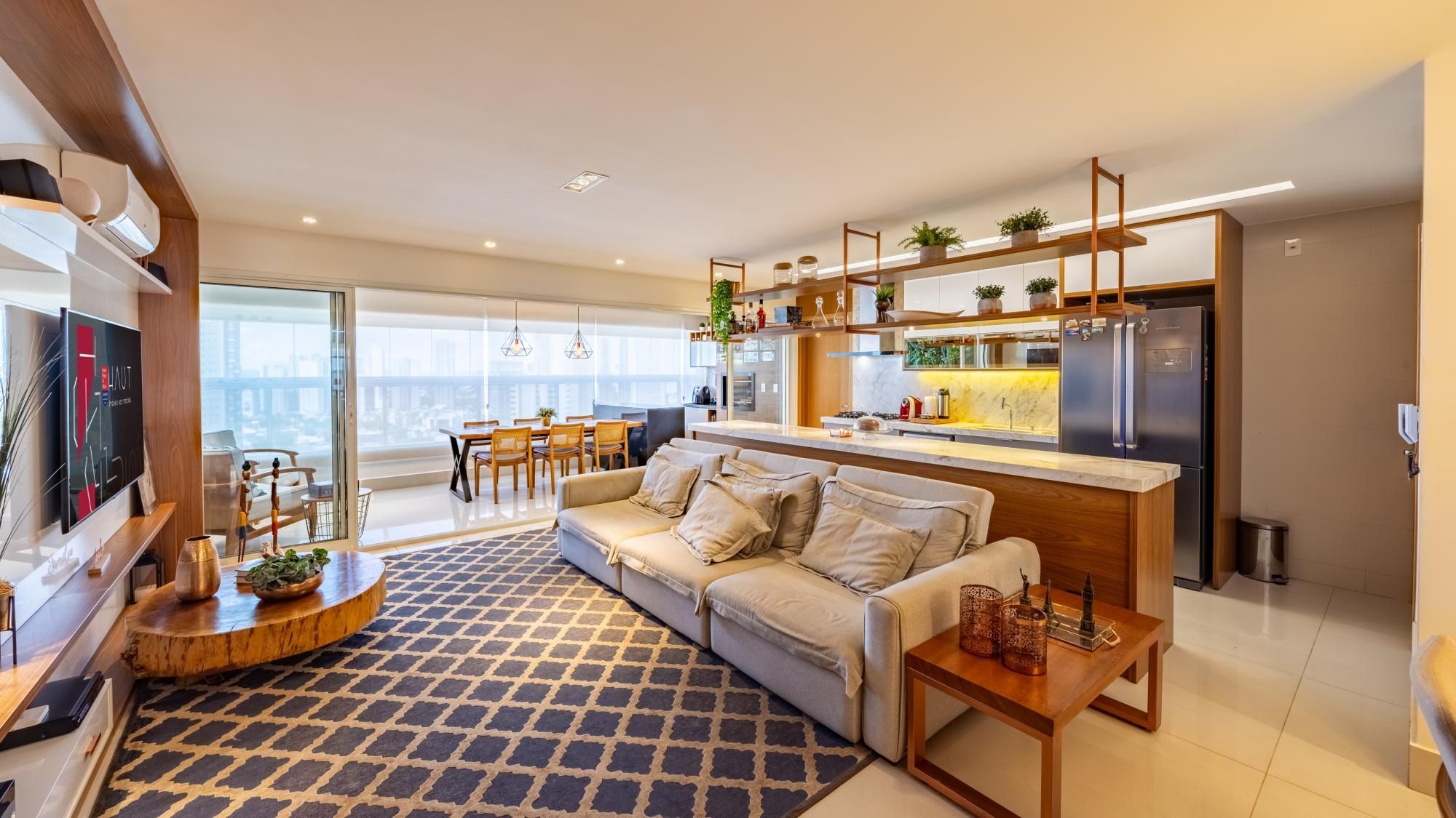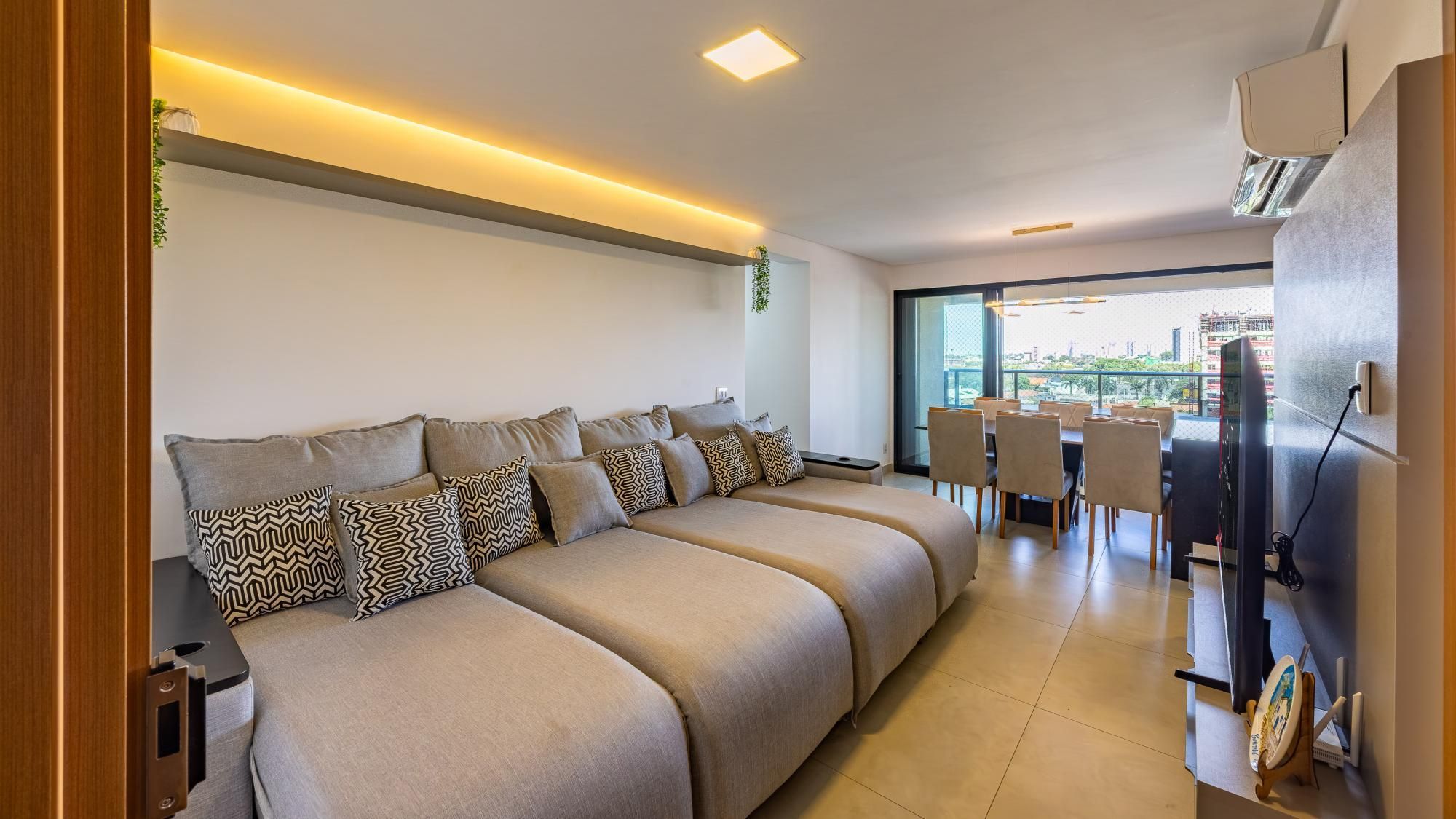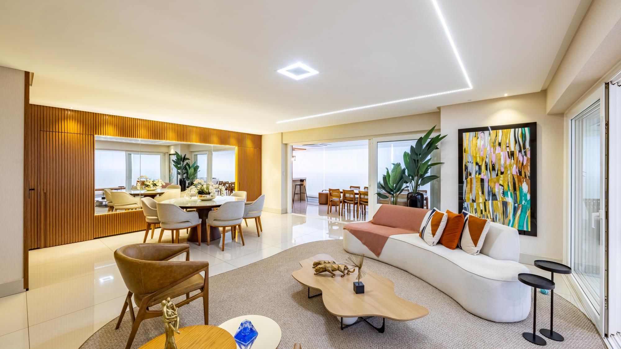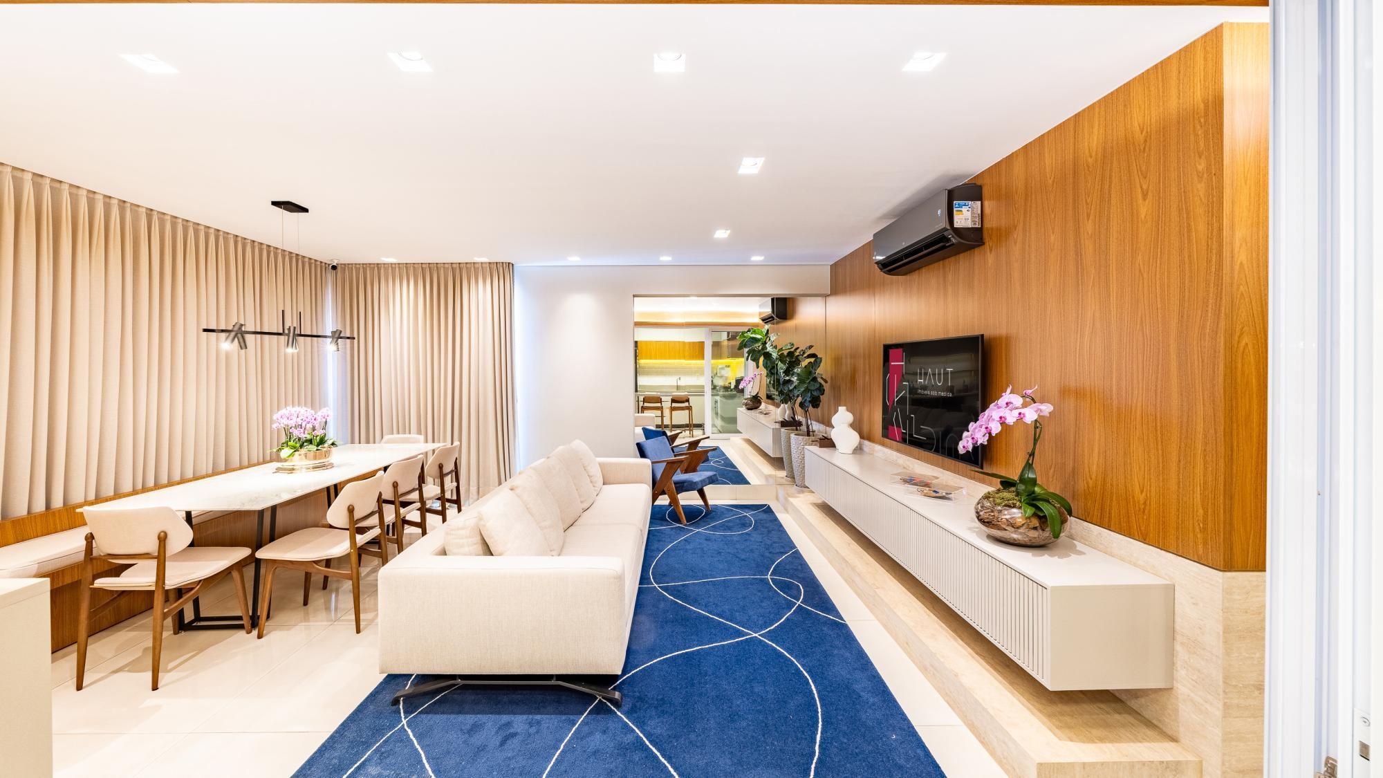 Apartamento de 89 m² no Tendence Home Resort. Logo ao entrar, o living com sala de estar, sala de jantar e varanda cria um espaço aconchegante e repleto de luz para viver sob medida. A iluminação planejada desenha o ambiente com suavidade e a marcenaria...